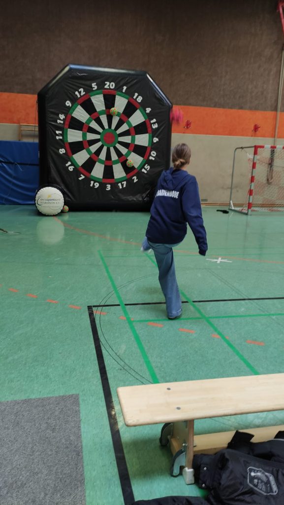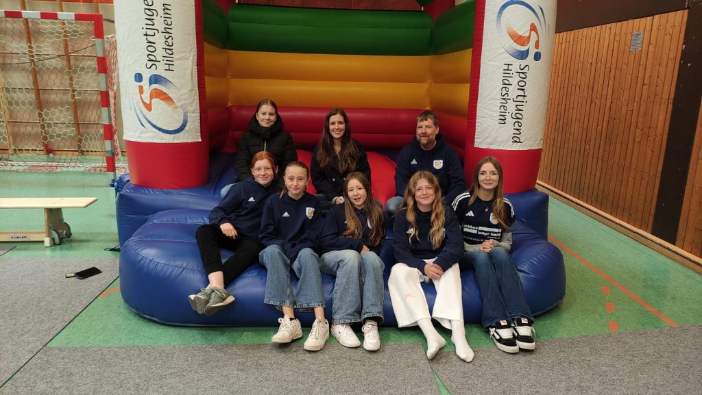 Christian Reymann mit den Fußball-Juinorinnen: Ausgabe der Wanderhefte und Spielgerätebetreuung