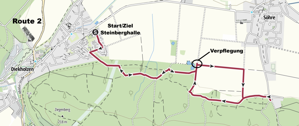 Start Sporthalle – Schönes Waldportal – Rhönsitten – Mittelpunkt der Gemeinde – (Versorgung) – Übergang Hauptstr. – Schweinestall – Mühlenberg alte Bahnschienen Richtung Söhre – oberhalb des Mühlenbergs Richtung Schwarze Heide – Kreuzung Wahrhausenstr. – Krähenweg – Alter Weg – Übergang Hauptstr. zurück.